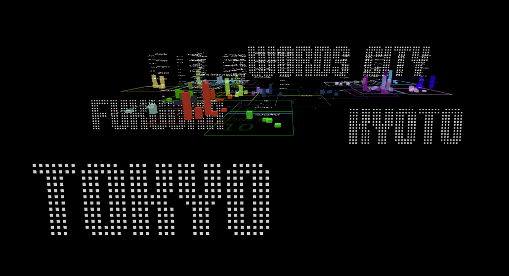 – la cartographie d’un territoire virtuel qui relie les trois villes (Tokyo, Kyoto et Fukuoka) dont les buildings, tels des briques statistiques, se construisent selon le nombre de mots envoyés dans chaque zone
