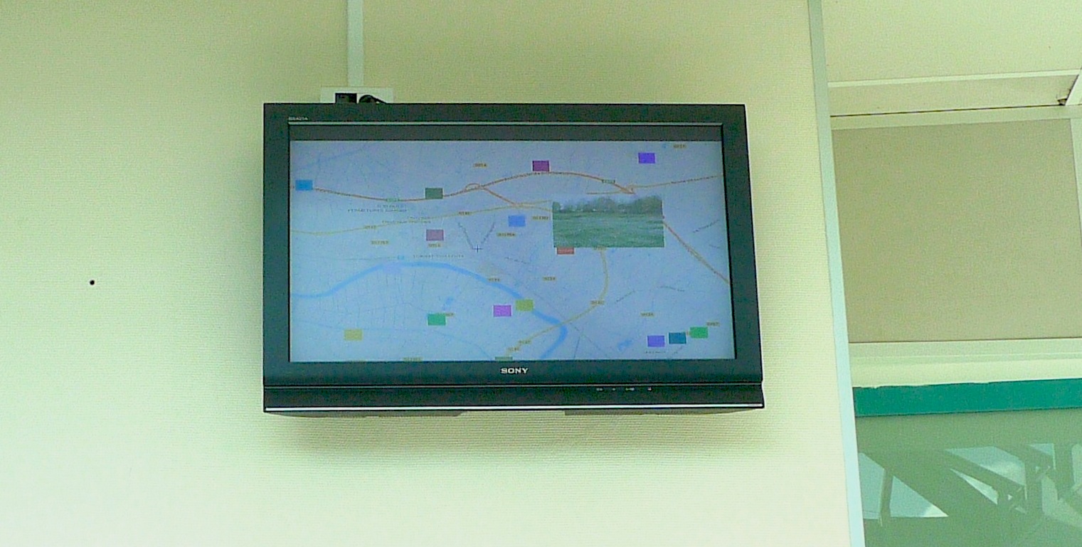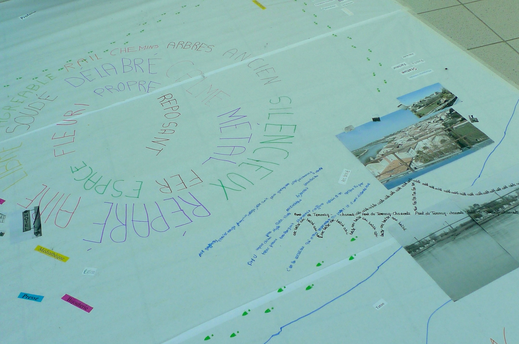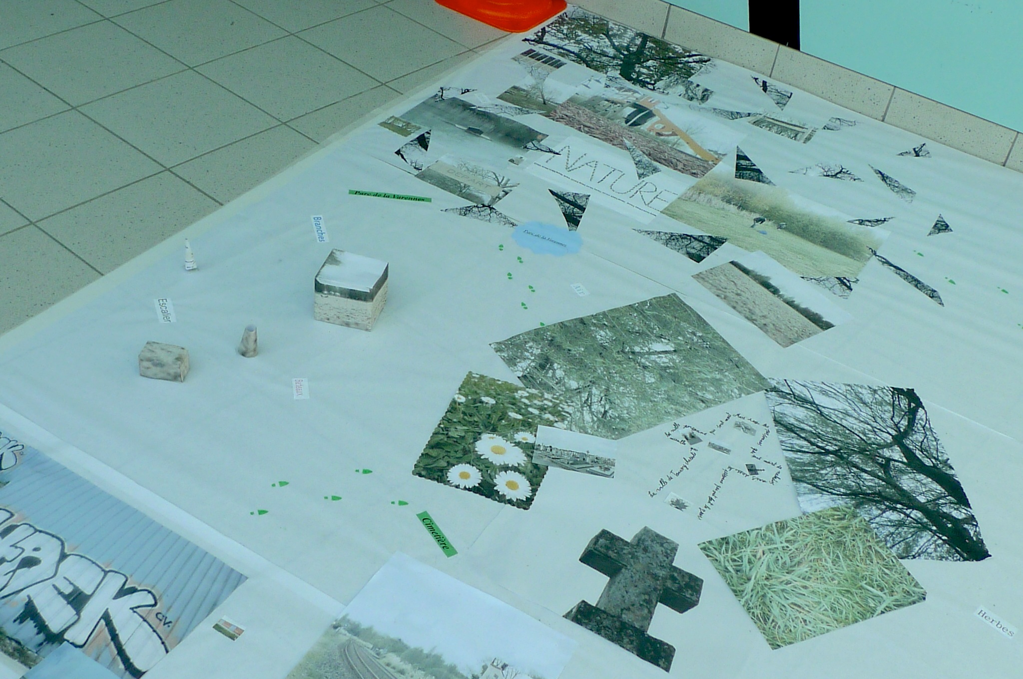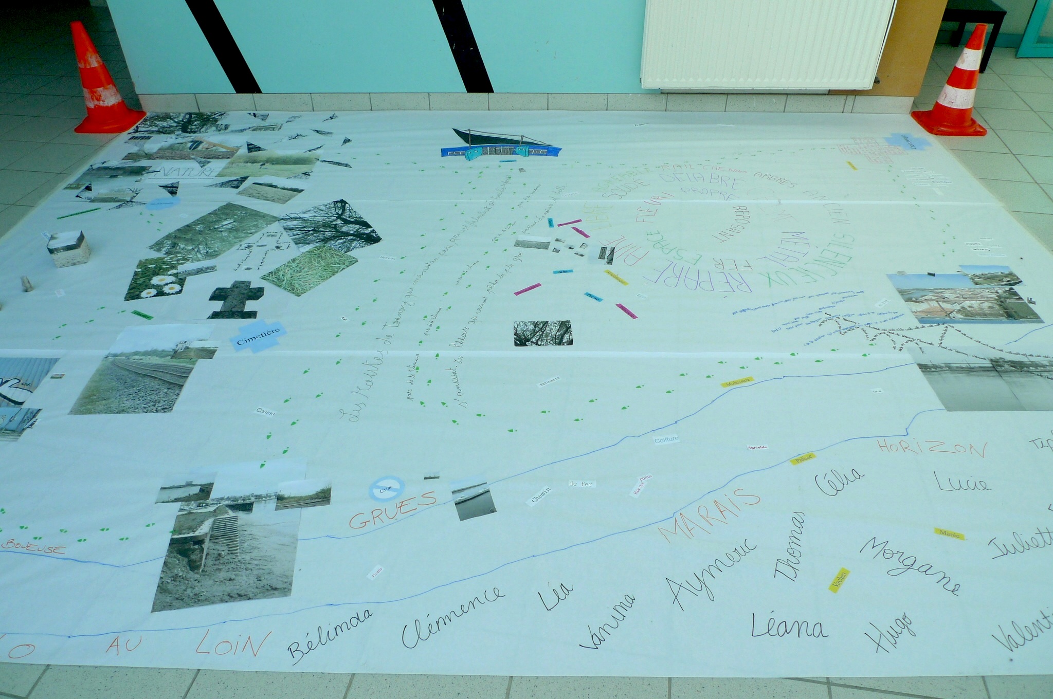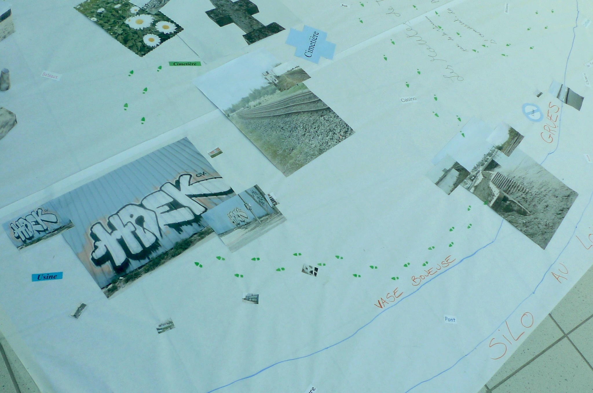 3e jour : à partir des traces prélevés, photos, textes et sons, ils ont réalisé de façon collective une carte subjective et poétique de leur territoire, en écho aux modules numériques crées sur Pure Data. Sur une grande surface blanche au sol, ils ont agencés les différents éléments prélevés pour inventer un poème cartographique et visuel, dan dune logique hybride entre dessin, écriture, collage, photographie et multimédia.