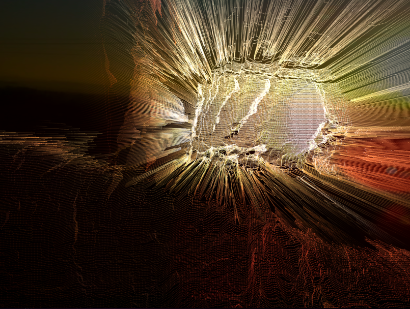 Les photographies sont des images capturées dans le flux numérique de la vidéo générative. Les paysages ainsi saisis déploient leur épaisseur, donnant à voir la matière spatiale et temporelle de l’instant diffracté et compacté par la mémoire. Chaque photographie est unique car produite par les variations infinies du programme.